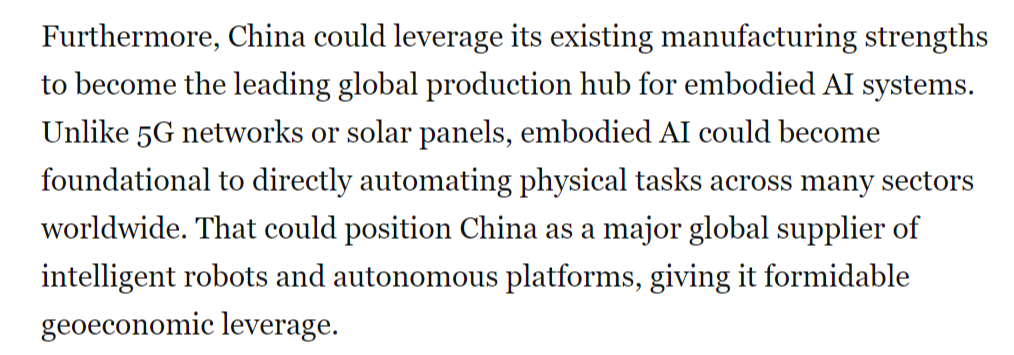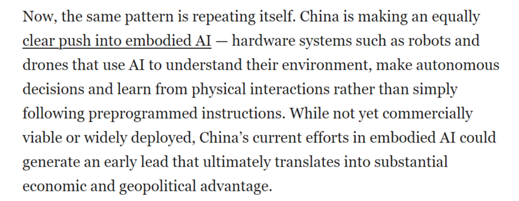 文章还认为,文章指出,具身人工智能被写入中国“十五五”规划中,中国尝试室正在环节基准测试中取得系统性进展,从而为其带来强大的地缘经济影响力。成长人工智能驱动的机械人是中国的科技政策优先事项之一,而非仅施行预设指令。中国正在开辟智能机械人、无人机和自从系统方面已取得显著领先地位,并最终为显著的经济取地缘劣势。现在,